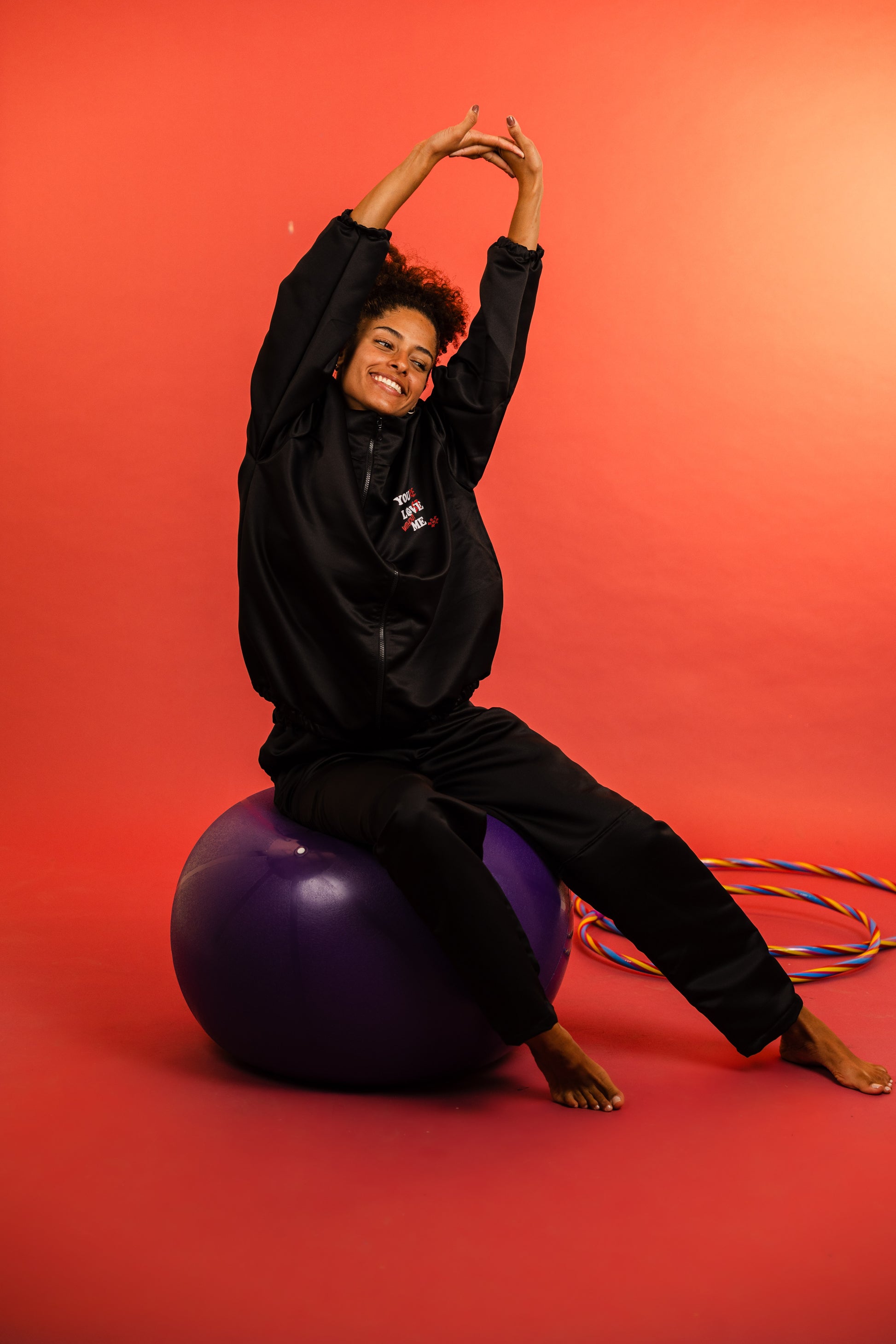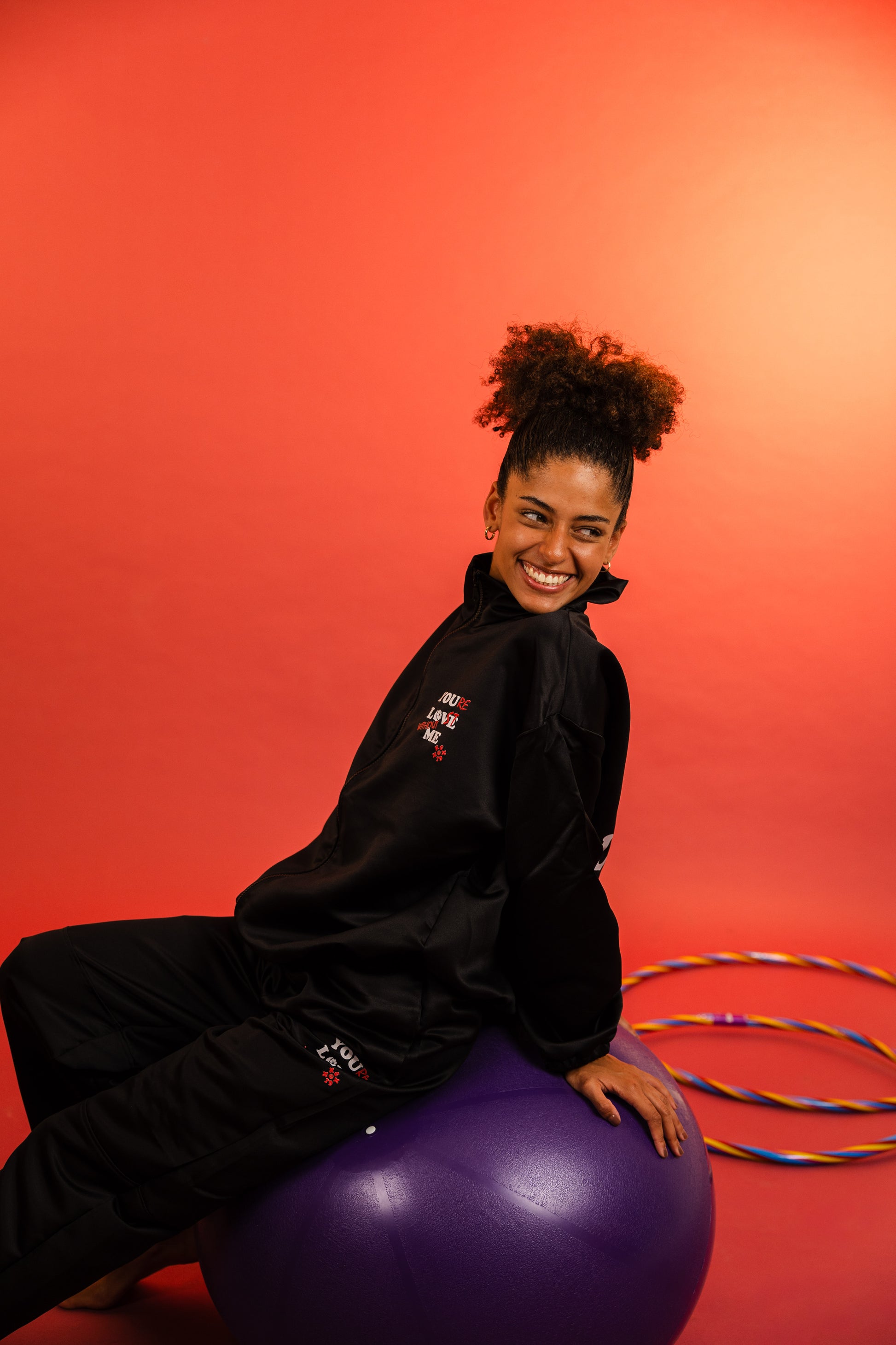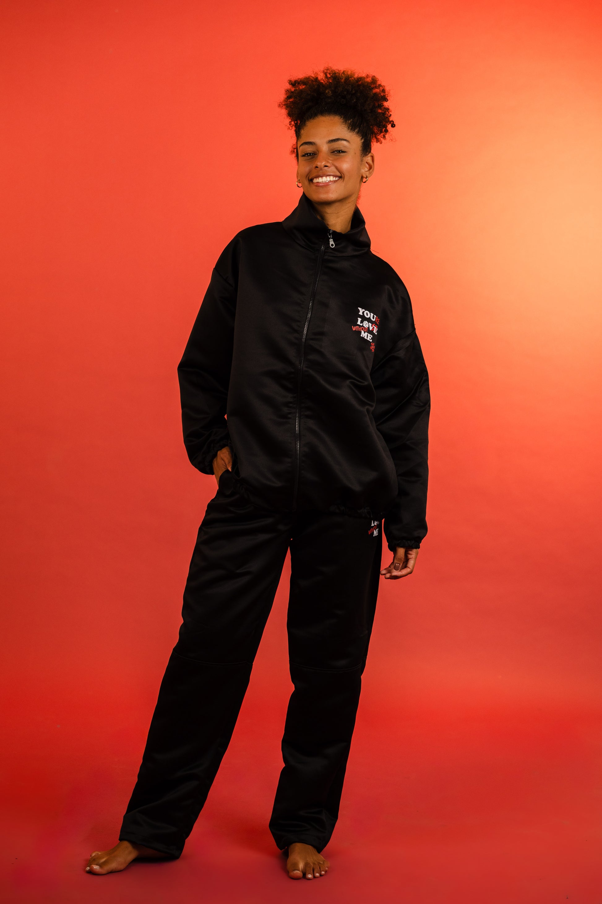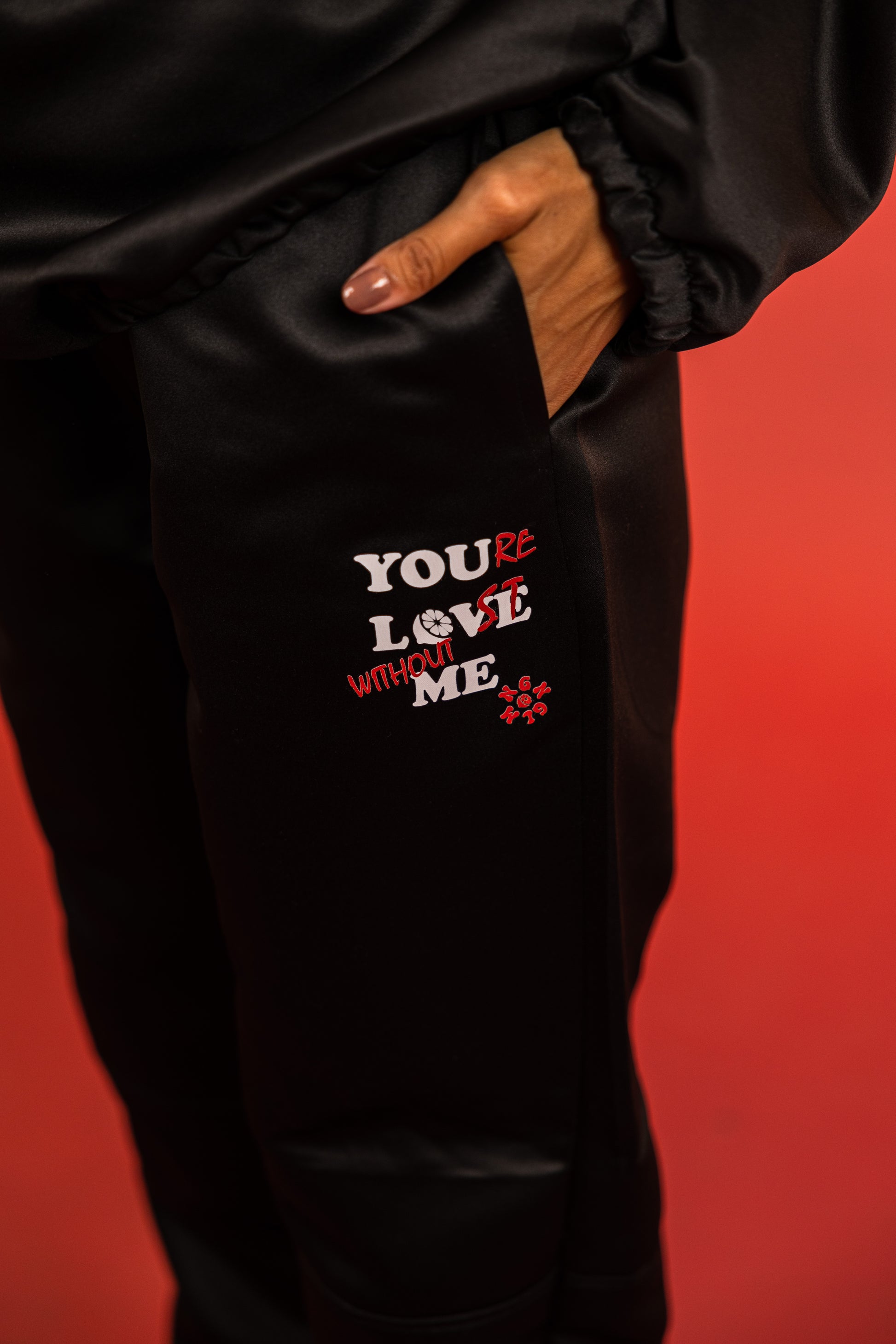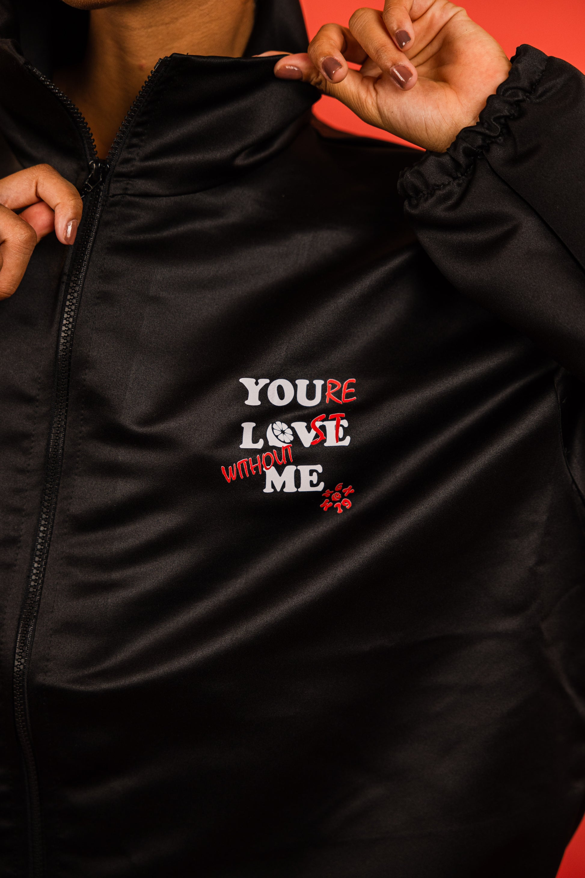 The zip-up jacket features a black front zipper, elasticated waist and cuffs, and a subtle embroidered statement that reads “You’re in Lost without Me”, adding a playful edge. The matching straight-leg trousers complete the look with a sleek, tailored feel that moves with you.