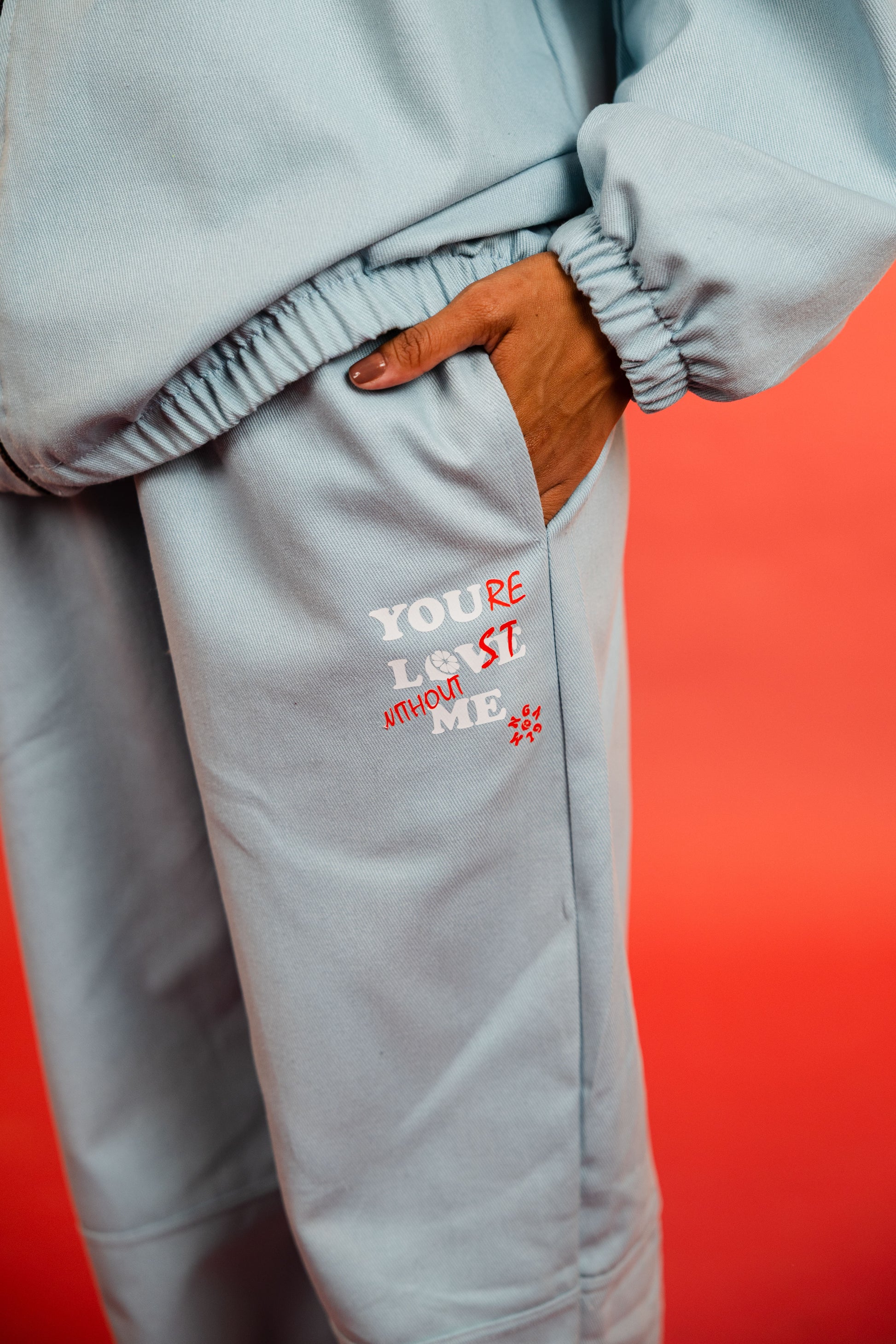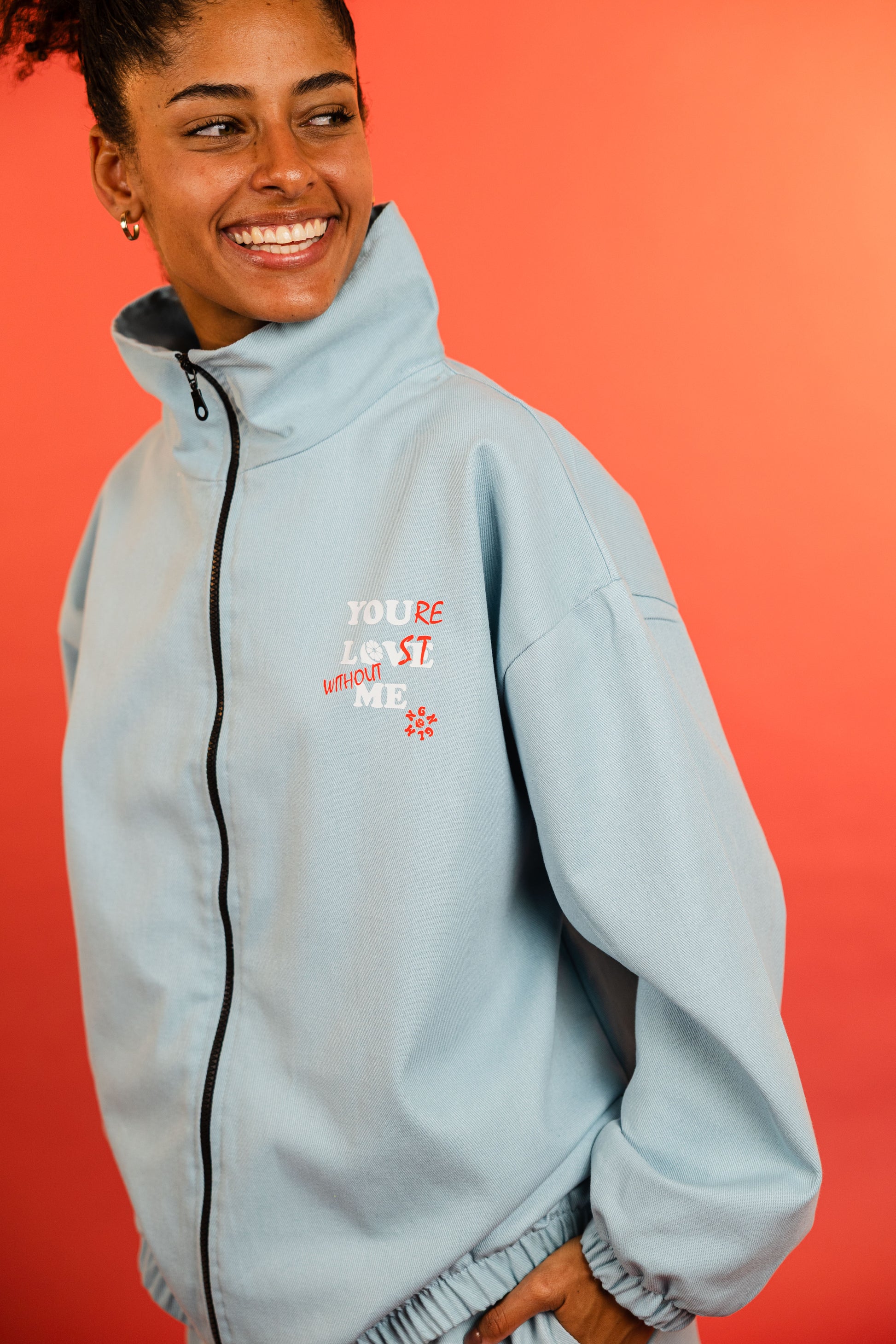 The Charm Denim Set in Sky Blue blends effortless street style with bold attitude. Crafted from soft, denim-look cotton, this set features a relaxed zip-up jacket with a sleek black front zipper and a standout “You’re Lost without Me” graphic across the back — a statement that speaks for itself.