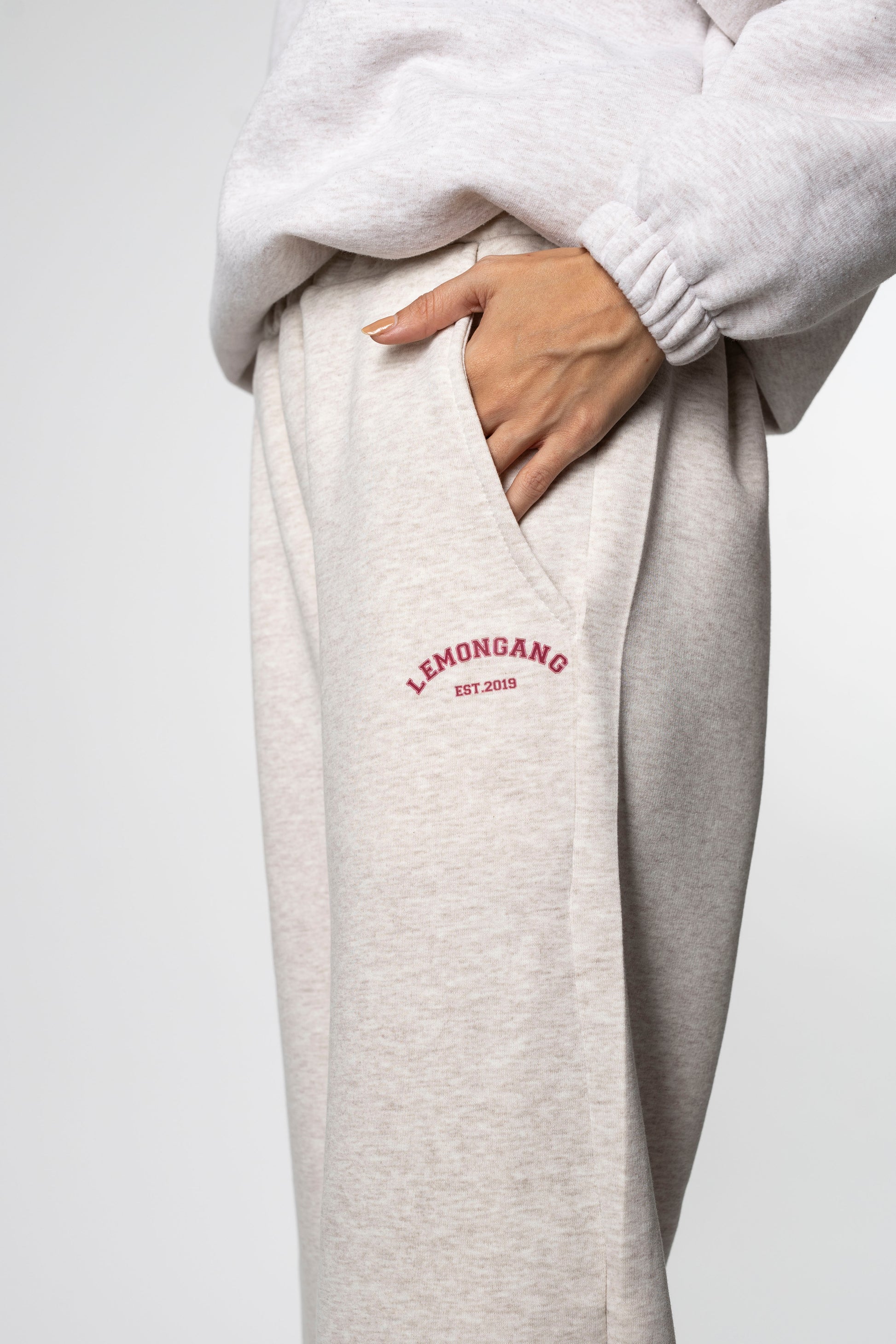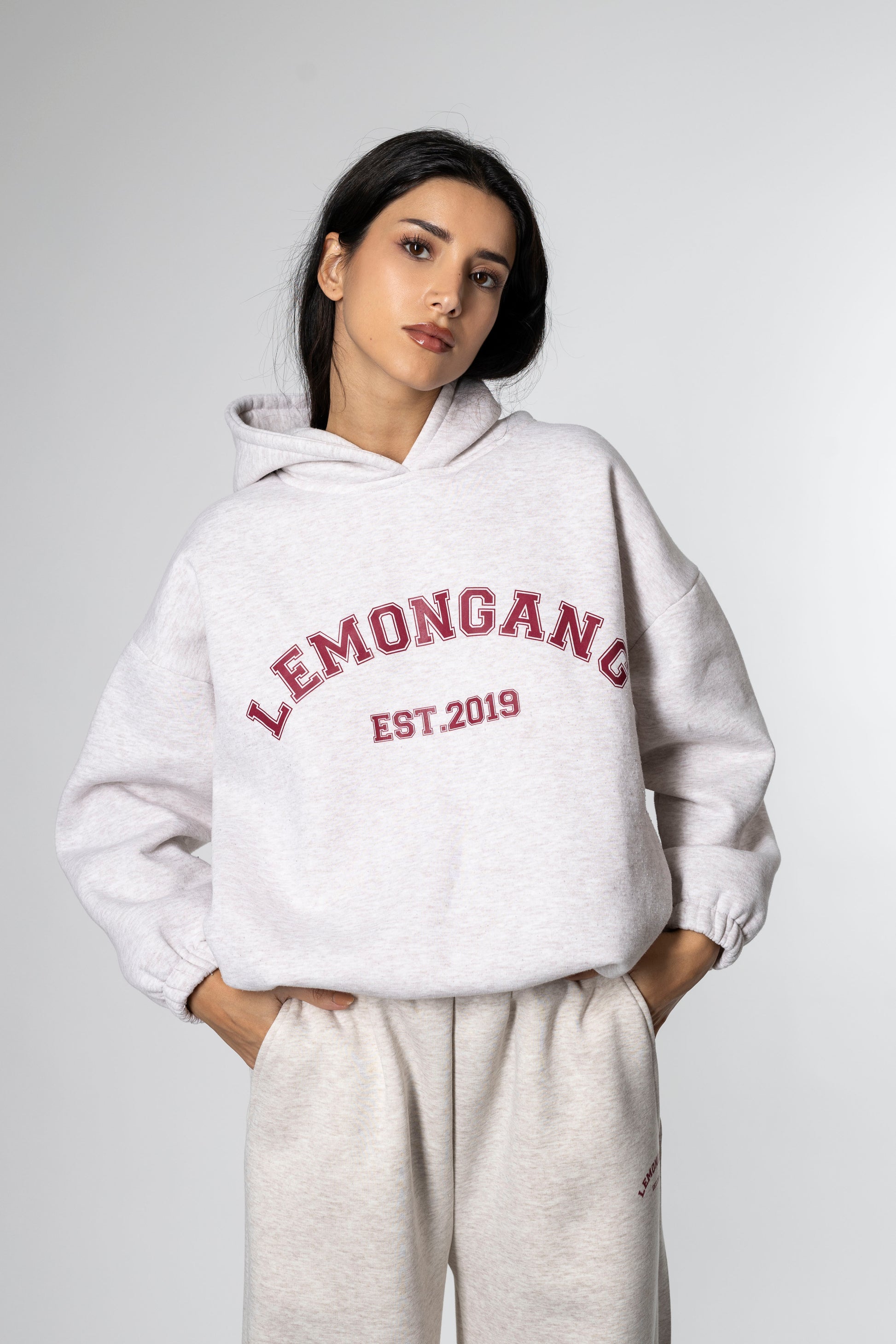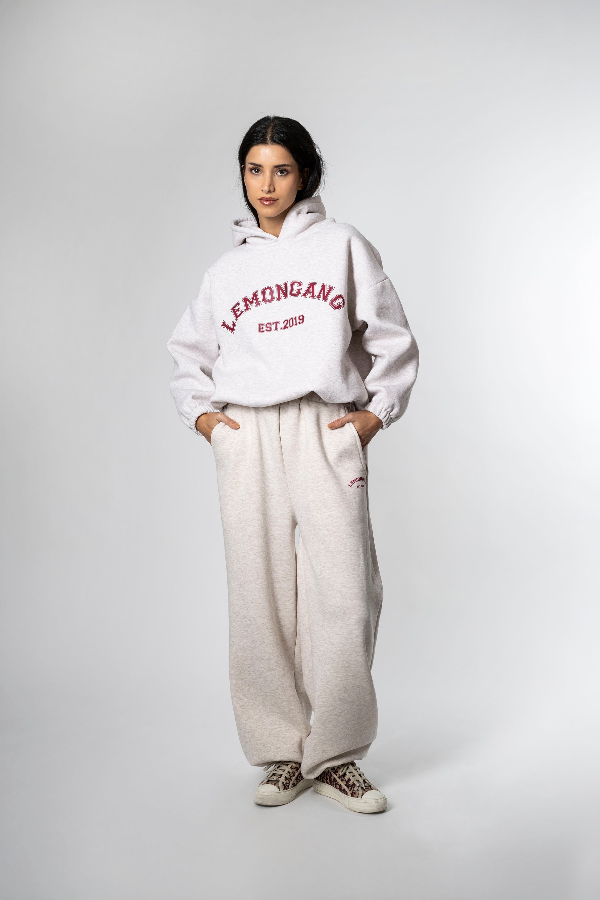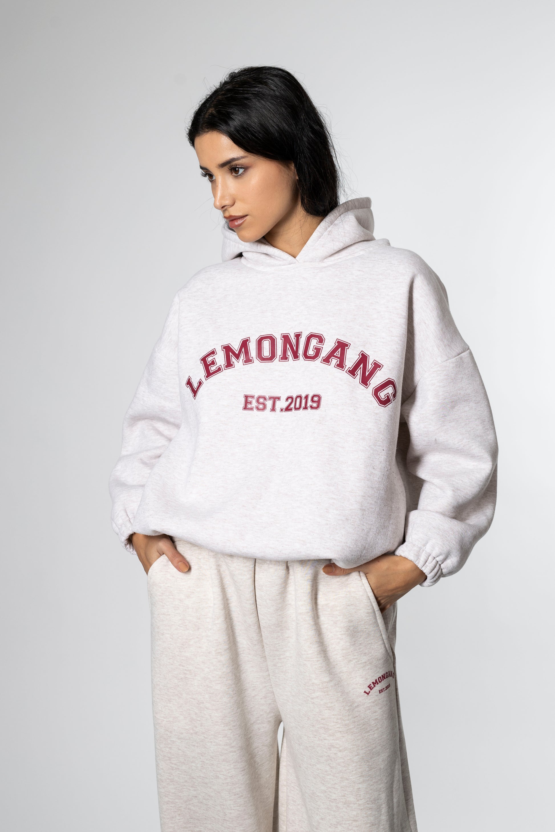 Lemongang's Classic Beige hoodie and jogger set with an oversized fit, crafted from a heavy weight jersey cotton. Super soft, pre-shrunk and piece dyed for the ultimate jersey. 'Lemongang EST 2019' College style printed to the chest.