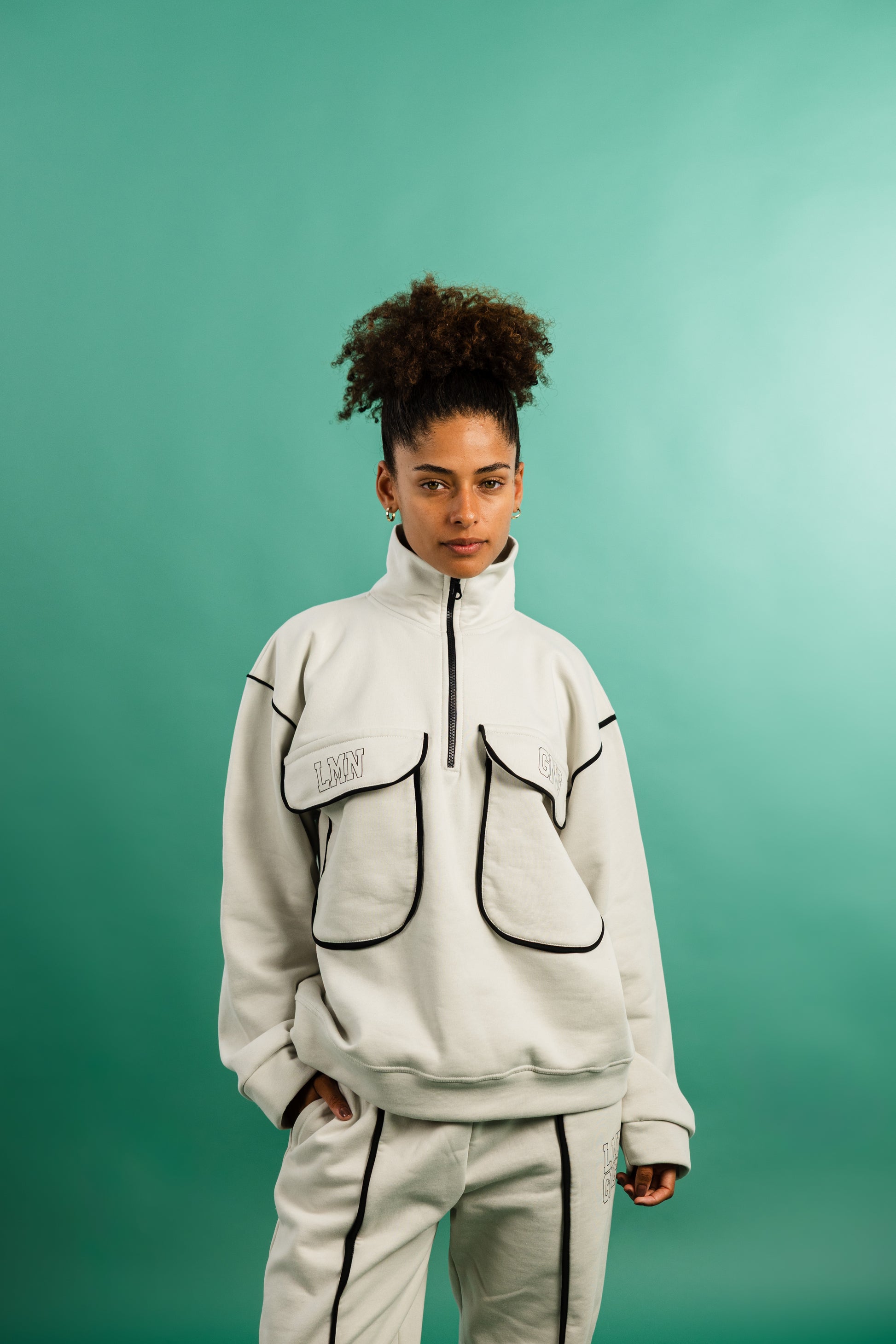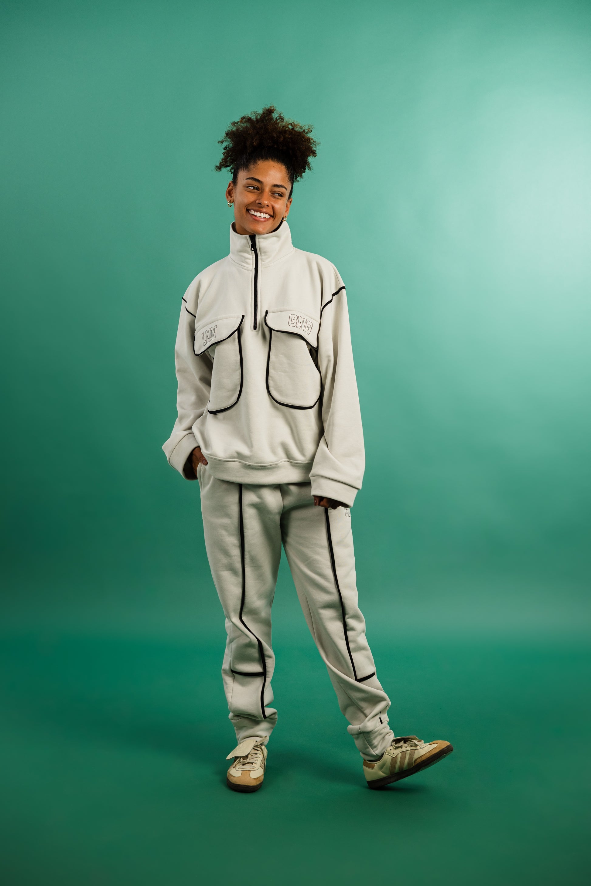 Featuring oversized utility pockets with bold contrast piping, the Nirvana Set brings a fresh, structured look to everyday wear. The relaxed silhouette offers effortless movement, while the neutral Bone color makes it easy to pair with anything in your wardrobe.